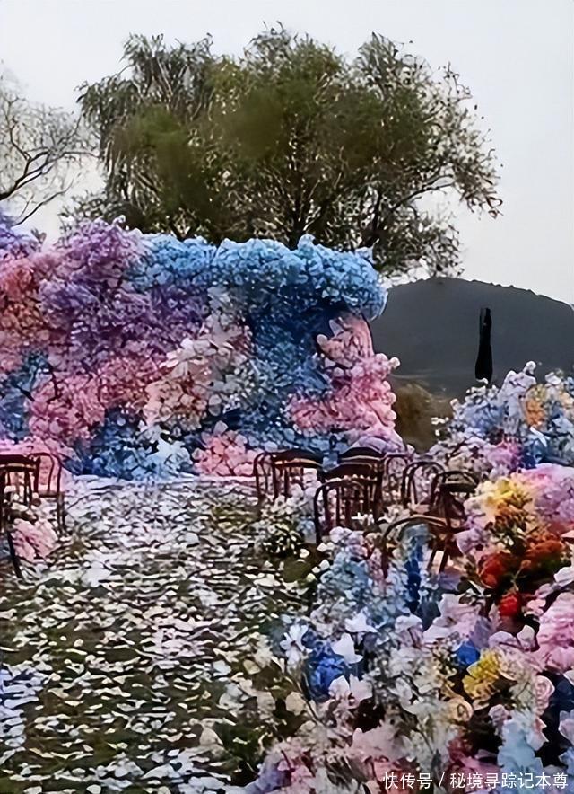 到了主舞台还好一点,背景是一片蓝粉色花墙,近看很是梦幻,稍微距离远一些,花墙背后的大树就藏不住了。